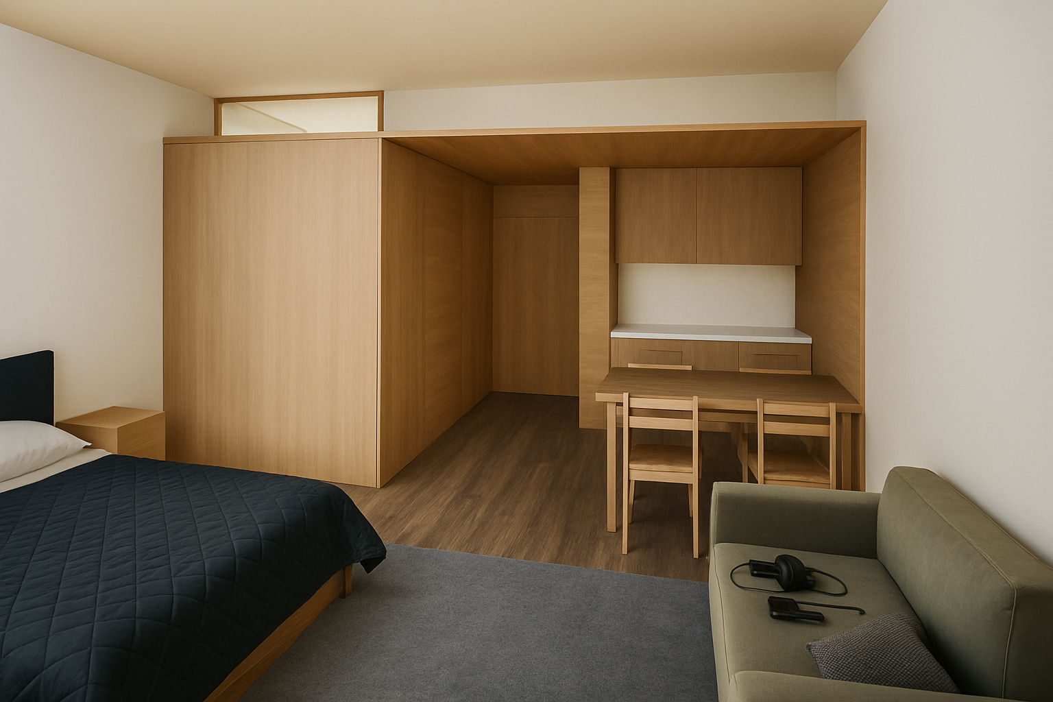 A proposta consistiu em unir os dois volumes e criar um único acesso vertical, solucionando também as diferenças de cota entre eles. Esta operação permitiu libertar metros quadrados essenciais e conceber uma habitação T8, com a possibilidade futura de ser fracionada em oito unidades T0. The strategy was to combine the two structures and introduce a single vertical access, also resolving the level differences between them. This approach unlocked valuable space, making it possible to design an eight-bedroom dwelling (T8) that can later be subdivided into eight studio units (T0).